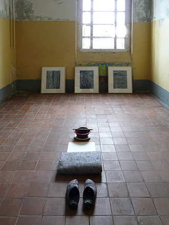 Abb. Miro Zahra, "Zelle", Rauminstallation mit Malmaterial, Umzugsdecke, Arbeitschuhen und drei Arbeiten auf Papier (gerahmt)